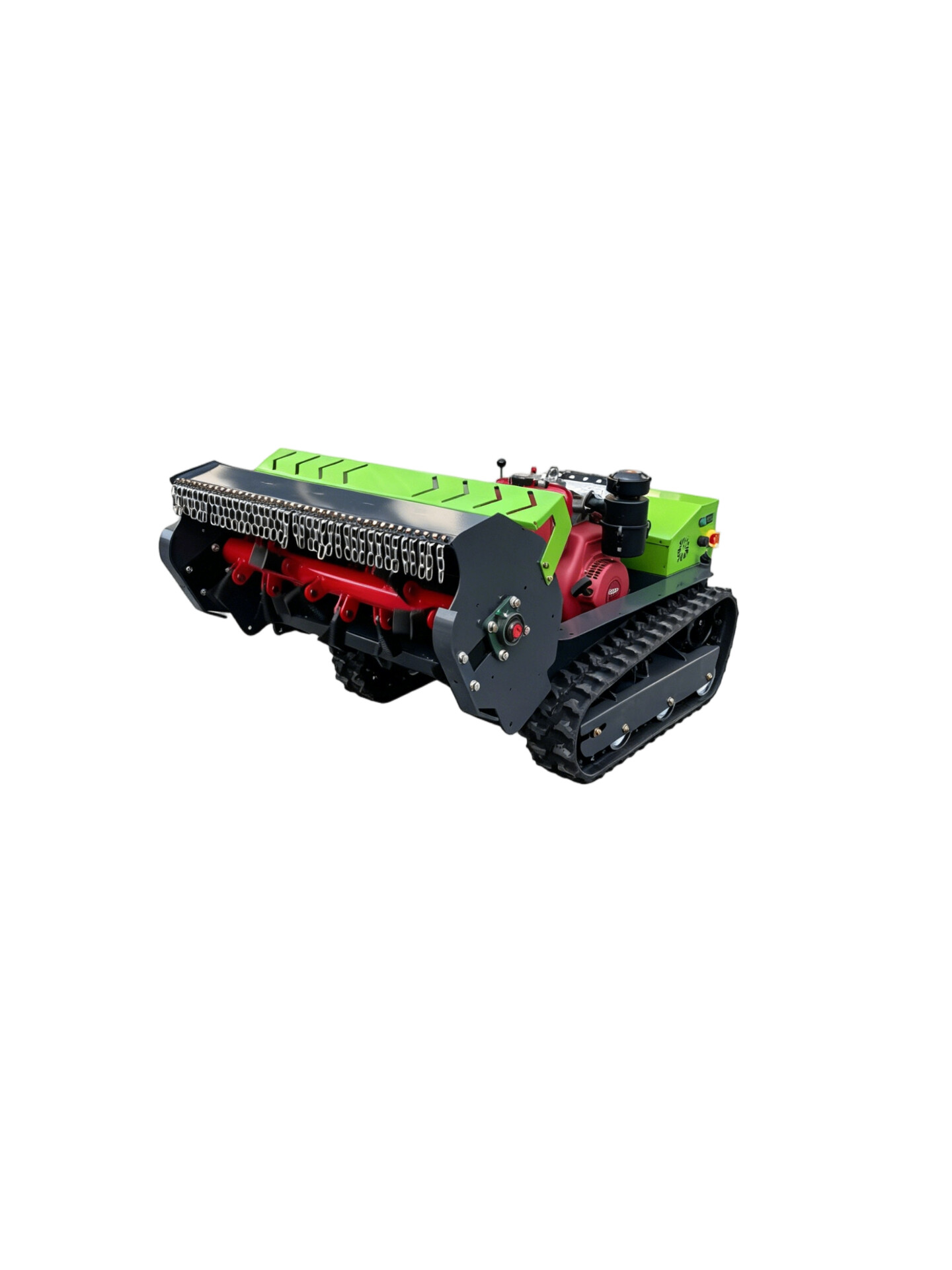 Model WP-1000 to potężna kosiarka bijakowa (mulczer) zdalnie sterowana, przeznaczona do najcięższych zadań rekultywacyjnych – czyszczenia nieużytków, pasów przeciwpożarowych, rowów melioracyjnych i wałów. Sercem maszyny jest jednocylindrowy silnik wysokoprężny KOOP Diesel 16 KM (opcjonalnie benzynowy Loncin 764 o mocy 25 KM), który napędza wał roboczy z 20 zestawami noży bijakowych (2 noże w każdym zestawie). Szerokość robocza 1000 mm, regulacja wysokości koszenia w zakresie 0–200 mm sterowana zdalnie z pilota oraz prędkość jazdy 0–3 km/h pozwalają precyzyjnie dobrać tempo pracy do warunków terenowych. Przedni zaczep głowicy (front hinge) umożliwia łatwą wymianę osprzętu, a bezszczotkowe silniki napędu jazdy gwarantują długą żywotność i niskie zużycie energii. Robocze wymiary maszyny to 1730 × 1150 × 800 mm przy masie 420 kg. WP-1000 pokonuje wzniesienia do 45°, a sterowanie radiowe zapewnia zasięg poniżej 200 m – pełna kontrola operatora z bezpiecznej odległości. Maszyna uruchamiana jest zdalnie, co eliminuje potrzebę bezpośredniego kontaktu z osprzętem przy starcie. Dla maksymalnej wszechstronności dostępne jest bogate wyposażenie opcjonalne: pług/spycharka, rama transportowa, talerzowa głowica boczna z łańcuchami, opryskiwacz pneumatyczny, opryskiwacz belkowy oraz worki na trawę.